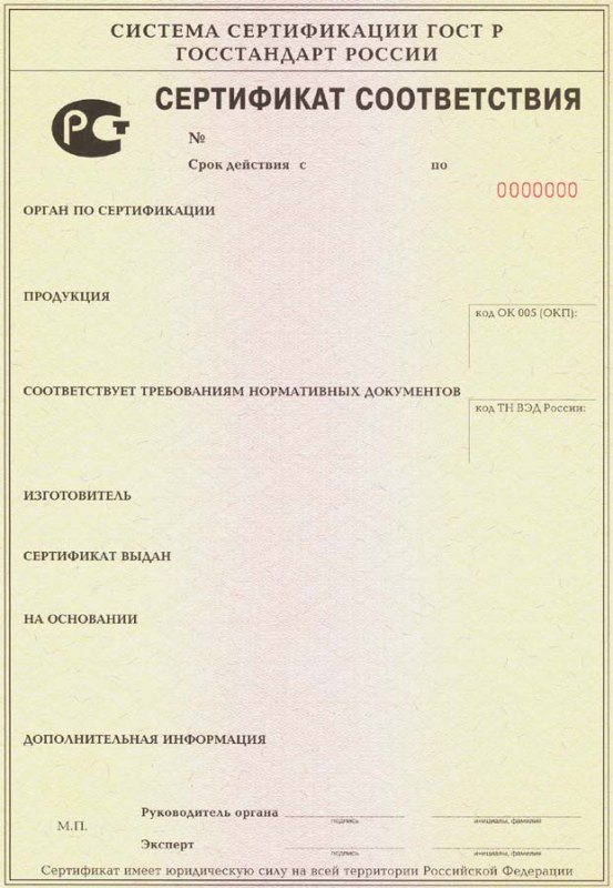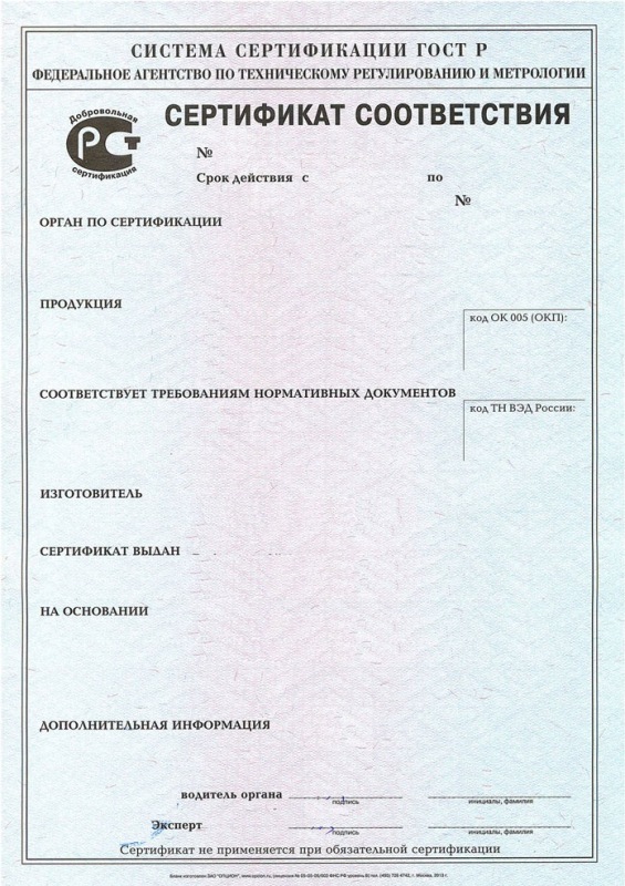 Istnieje Postanowienie regulujące konieczność otrzymania certyfikatu zgodności dla różnej produkcji (Postanowienie Gosstandartu FR z dnia 30 lipca 2002 r. nr 64 „O Nomenklaturze produktów i usług (robót), podlegających obowiązkowej certyfikacji i Nomenklaturze produktów, których zgodność może być potwierdzona deklaracją zgodności”).